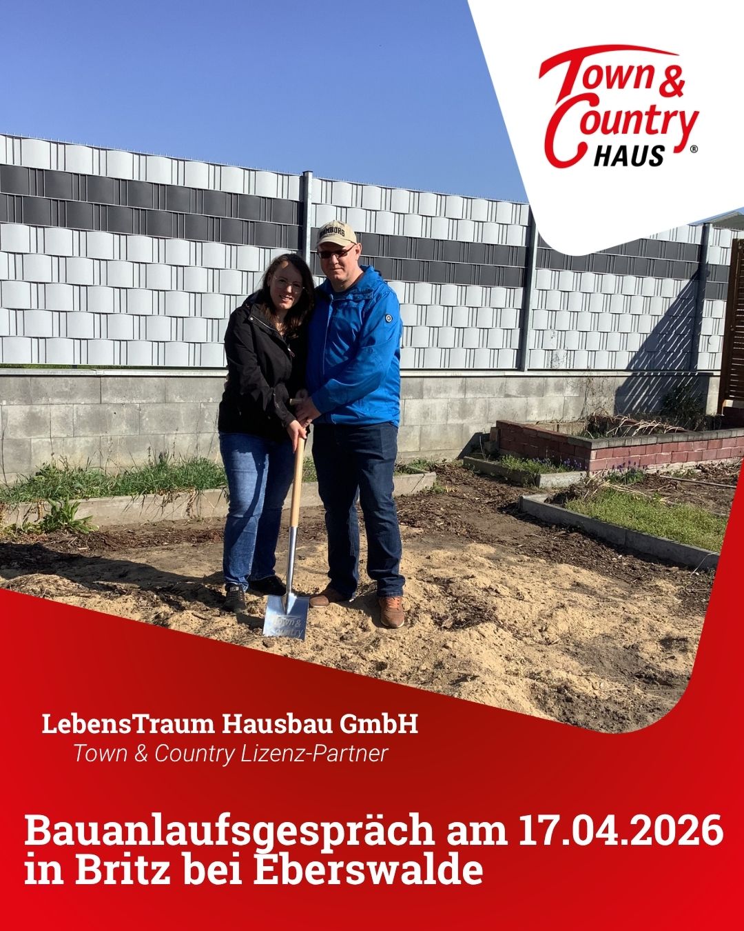 Familie Q. hat im wunderschönen Britz bei Eberswalde sich mit unserem Bauleiter am 17.04.2026 getroffen. Nun wurde direkt vor Ort das weitere Geschehen Ihres Bodensees 129 besprochen. Bald wird der Bau beginnen. Dabei haben unsere Bauherren Ihren ersten Spatenstich gemacht. Wir die Lebenstraum Hausbau GmbH und die LebensTraum PROJEKT GmbH wünschen Ihnen eine schöne Bauzeit.