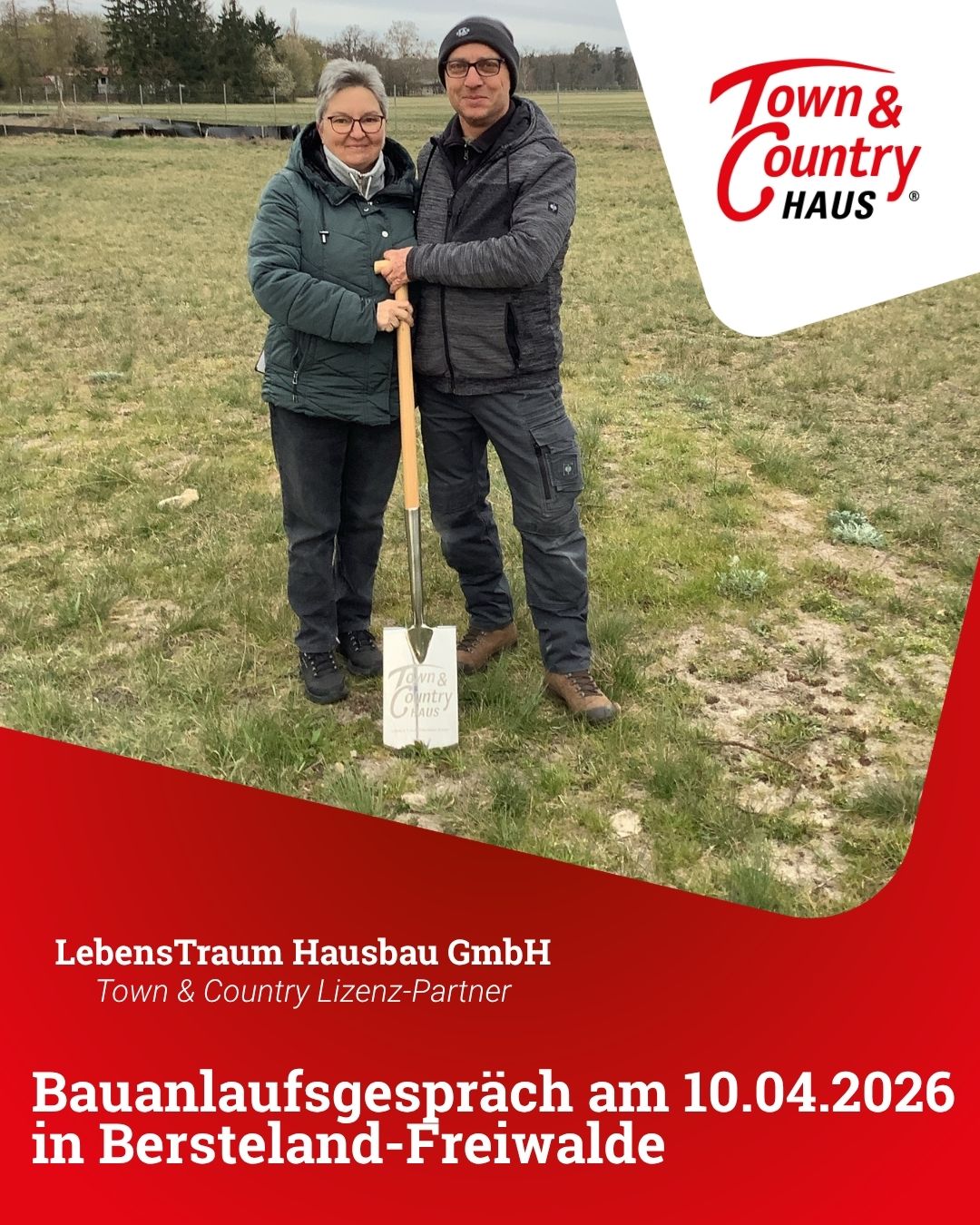 Am 10.04.2026 hat Familie S. ihren traditionellen Spatenstich gemacht. In kurze beginnt hier der Bau des Flair 110. Die Lebenstraum Hausbau GmbH und die LebensTraum PROJEKT GmbH wünschen eine entspannte Bauphase.