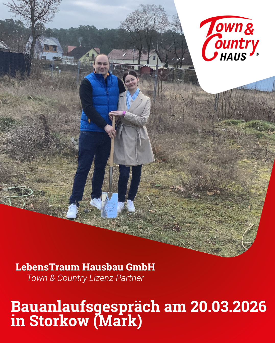 Familie V. konnte am 20.03.2026 ihren traditionellen Spatenstich vollbringen. Hier beginnt in Kürze der Bau des Flair 110. Wir, die Lebenstraum Hausbau GmbH und die LebensTraum PROJEKT GmbH, wünschen Ihnen eine entspannte Bauphase.